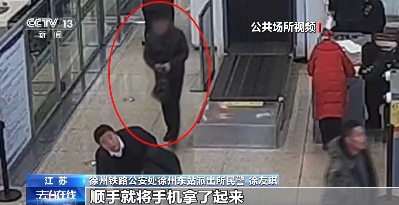 徐州铁路公安处徐州东站派出所民警 徐友琪:这名黑衣男子在拿回自己的行李时发现了手机,顺手就将手机拿了起来,然后放在裤子口袋里,若无其事地前往候车室候车。