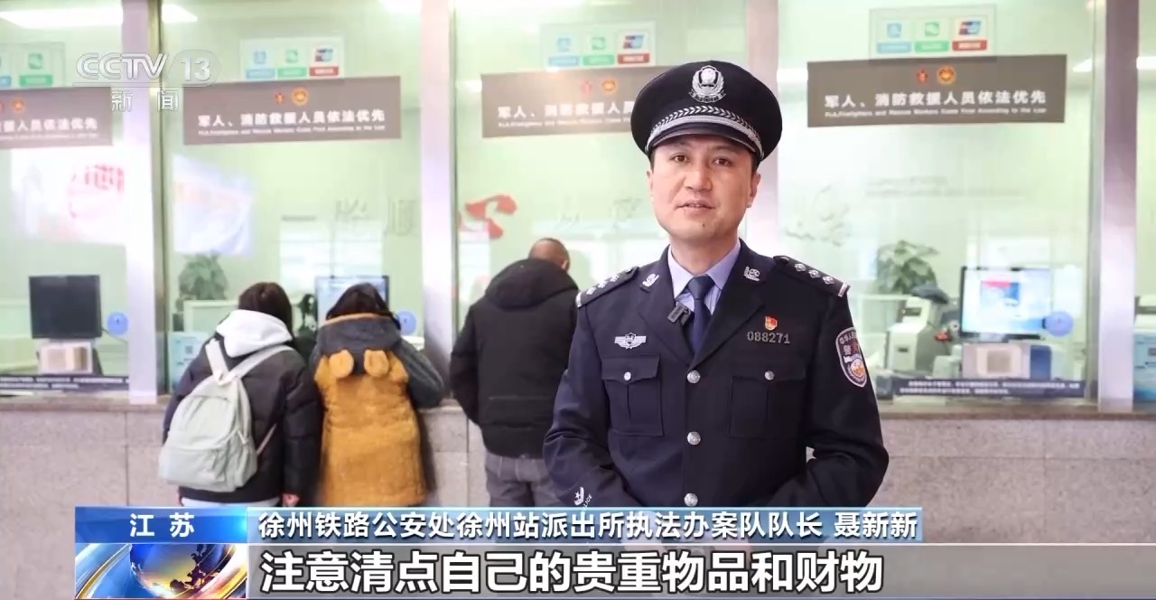 徐州铁路公安处徐州站派出所执法办案队队长 聂新新:春运来临,客流大幅增加,容易造成拥挤,旅客在售票窗口买完票后,注意清点自己的贵重物品和财物,比如手机和钱包等贵重物品,清点完之后再离开售票大厅。