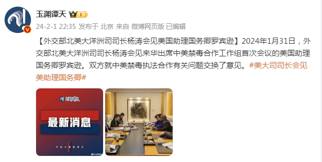 2024年1月31日,外交部北美大洋洲司司长杨涛会见来华出席中美禁毒合作工作组首次会议的美国助理国务卿罗宾逊。双方就中美禁毒执法合作有关问题交换了意见。