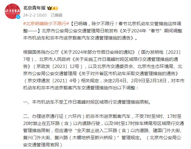 根据国务院办公厅《关于2024年部分节假日安排的通知》(国办发明电〔2023〕7号)、北京市人民政府《关于实施工作日高峰时段区域限行交通管理措施的通告》(京政发〔2023〕12号),以及北京市交通委员会、北京市生态环境局、北京市公安局公安交通管理局《关于对外省区市机动车采取交通管理措施的通告》(京交绿通发〔2021〕4号)相关规定,决定2月4日、2月9日至2月18日,对本市机动车和非本市进京载客汽车交通管理措施作出以下调整: