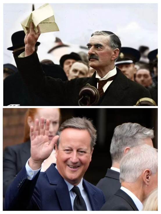 据报道,齐克里在帖文中附上了一张图片,下面是卡梅伦挥手致意的照片,上面则是张伯伦举出1938 年《慕尼黑协定》文件的图片,该协定允许纳粹德国吞并捷克斯洛伐克的部分领土,以避免欧洲再次发生大规模战争。报道提到,张伯伦当时从慕尼黑谈判归来后宣布,“我们这一代人的和平已经得到了保证”。