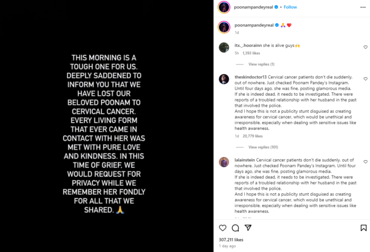2月2日,印度女明星普纳姆·潘迪的社交媒体账号发布了一则讣告,内容是普纳姆日前已因宫颈癌去世,消息发布后,数百万印度网民发文哀悼她的猝然离世。