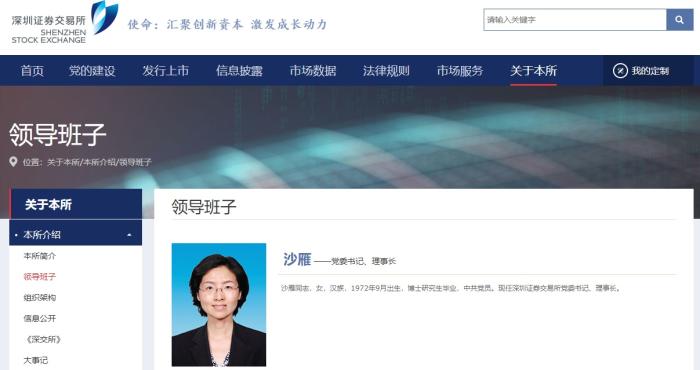 中新网2月4日电 深圳证券交易所官网“领导班子”栏目显示,此前已担任深圳证券交易所党委书记的沙雁,出任深圳证券交易所理事长。资料显示,沙雁,女,汉族,1972年9月出生,博士研究生毕业,中共党员。现任深圳证券交易所党委书记、理事长。(中新财经)