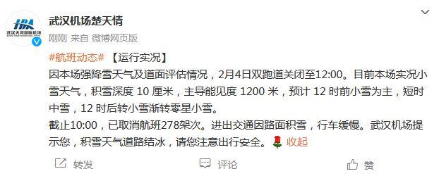 截止10:00,已取消航班278架次。进出交通因路面积雪,行车缓慢。武汉机场提示乘客,积雪天气道路结冰,请您注意出行安全。