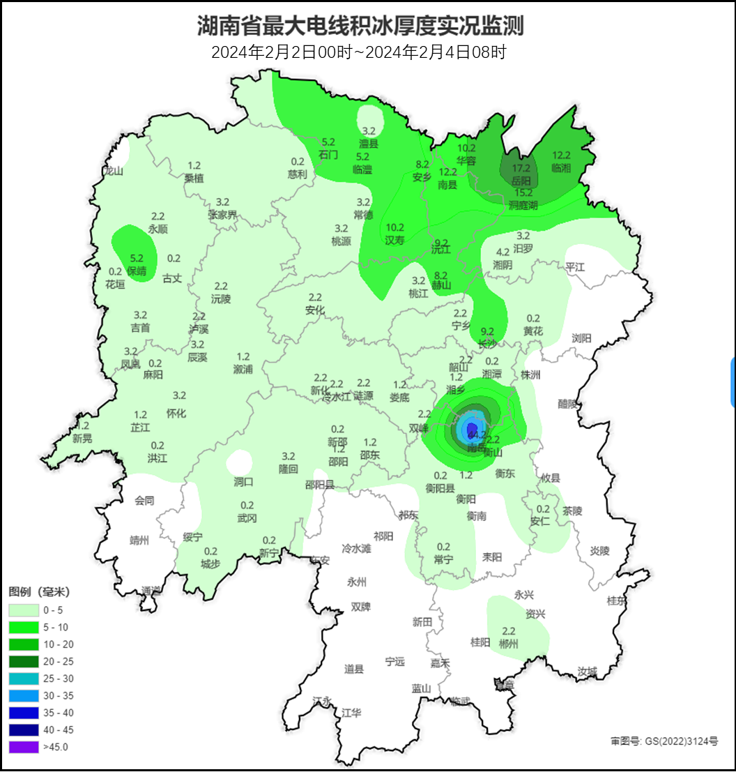 电线积冰:59县(市、区)出现电线积冰,其中12县(市、区)最大电线积冰厚度超过5毫米,汉寿、南县、岳阳县、临湘、华容超过10毫米,最大为岳阳县17.2毫米。
