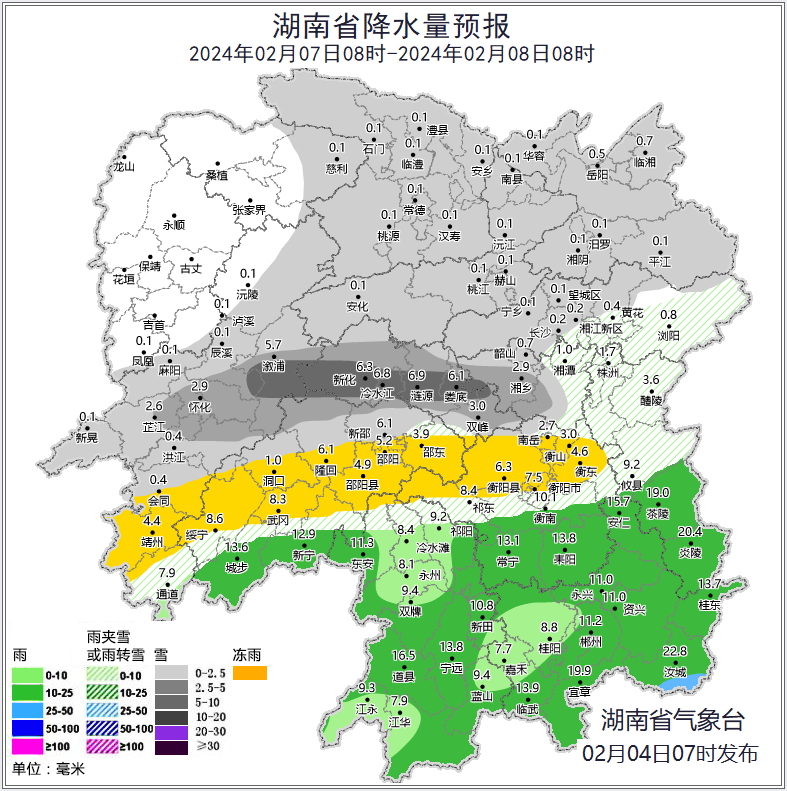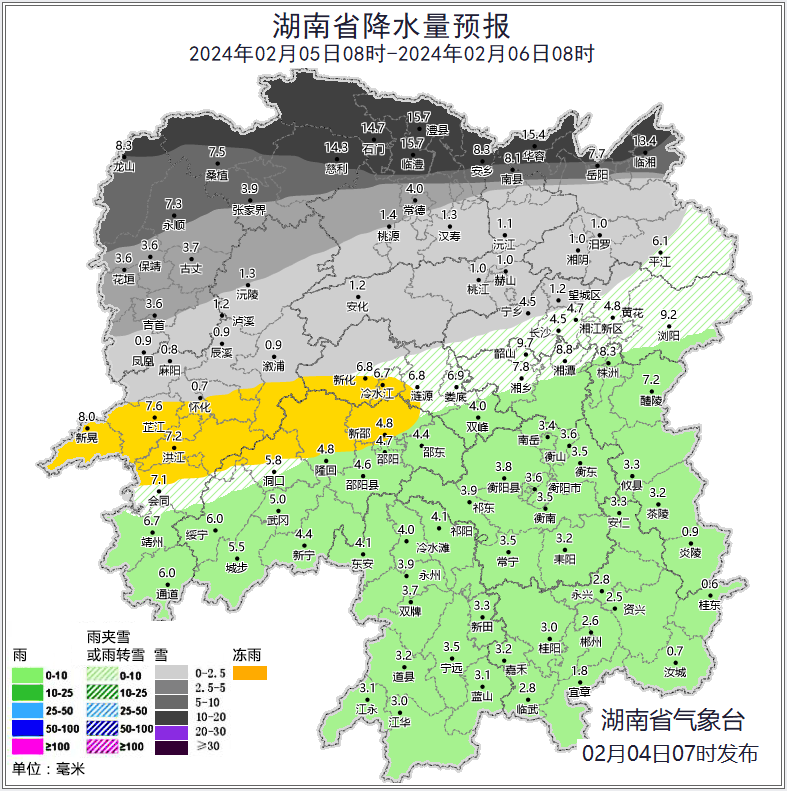 7日,湘中阴天有小到中雪、雨夹雪或冻雨,其中怀化中部、娄底、湘潭西部局地大雪,湘北雪或冻雨转阴天,其他地区阴天有小到中雨;最低气温-2~0℃。