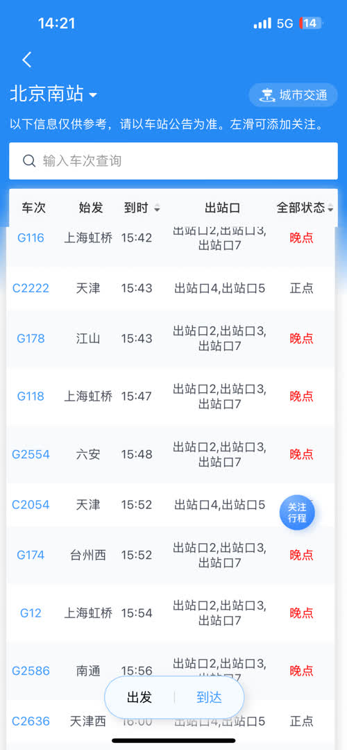 北京南站也有部分始发终到列车晚点。北京南-台州西G187、北京南-上海虹桥G143、北京南-太湖南G2595等14趟列车处于晚点状态。始发于上海虹桥、合肥南、六安的二十余趟终到北京南站的列车处于晚点状态,多趟晚点超60分钟。