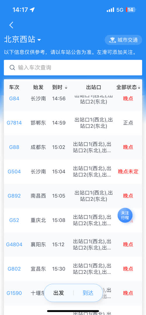 截至14点15分,记者在12306“车站大屏”看到,今日,北京西-南昌T145/T148、北京西-成都东G89、北京西-武汉G523、北京西-南昌T167处于晚点状态。始发于长沙南、成都东、重庆北、襄阳东等超20趟终到北京西的列车处于晚点状态。