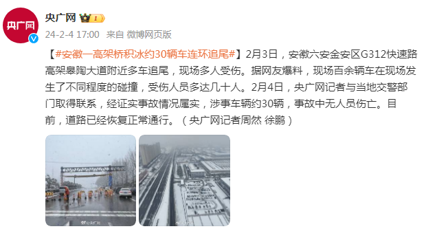 2月3日,安徽六安金安区G312快速路高架皋陶大道附近多车追尾,现场多人受伤。据网友爆料,现场百余辆车在现场发生了不同程度的碰撞,受伤人员多达几十人。2月4日,央广网记者与当地交警部门取得联系,经证实事故情况属实,涉事车辆约30辆,事故中无人员伤亡。目前,道路已经恢复正常通行。(央广网记者周然 徐鹏)