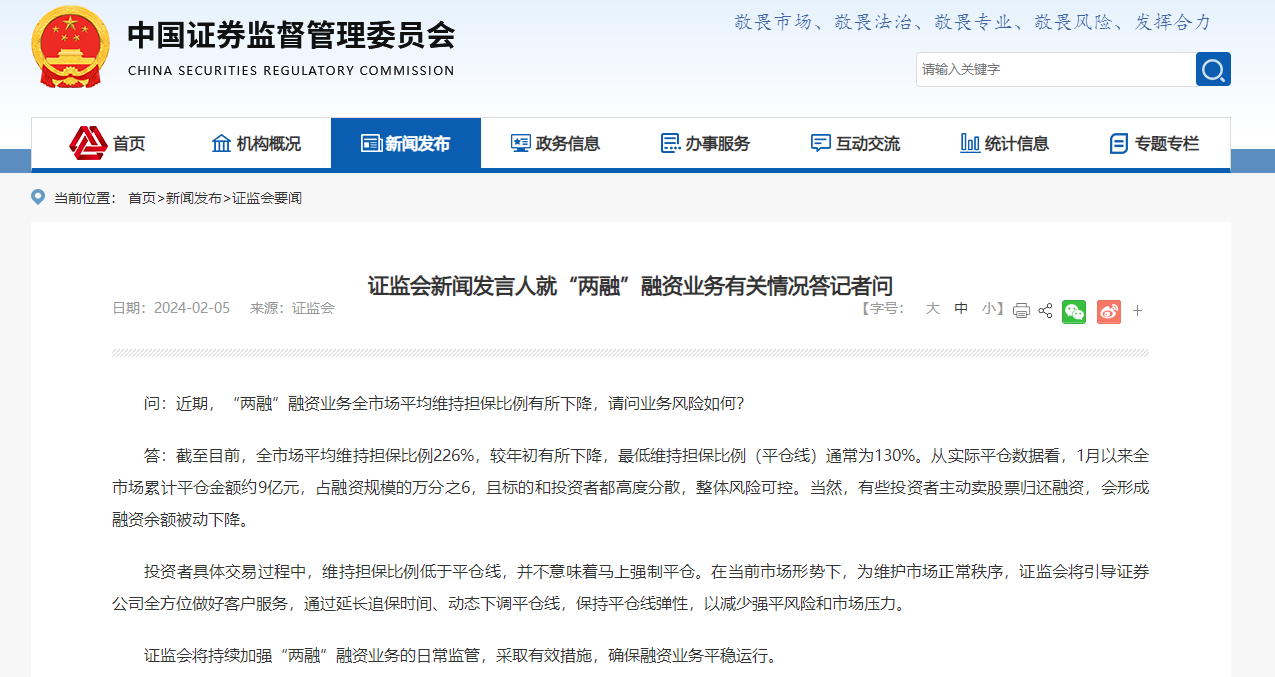 证监会将持续加强“两融”融资业务的日常监管,采取有效措施,确保融资业务平稳运行。