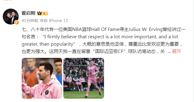 【环球网报道】美国职业足球大联盟球队迈阿密国际与中国香港明星队2月4日下午在香港大球场进行表演赛。球星梅西当天未上场,引发球迷不满。香港立法会议员(体育、演艺、文化及出版界)霍启刚6日在微博发文表示,我们为球队到来准备的精心安排,却被狠狠践踏,令人遗憾。全文如下: