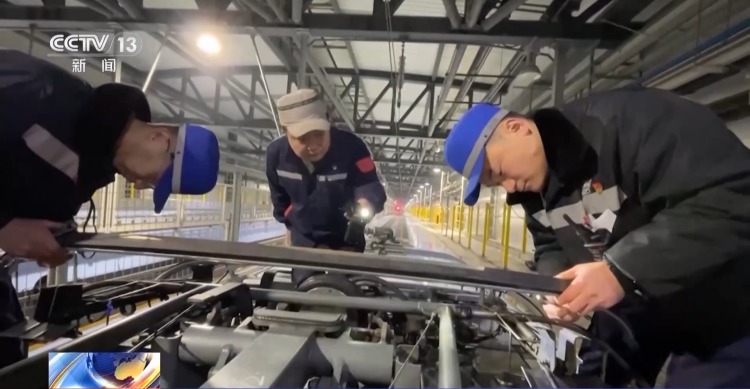 总台央视记者 蒋树林:郑州东动车所,相当于动车组列车的4S店,在动车组列车的车顶还有冰雪,工人师傅现在正忙着给动车组列车安装除冰碳滑板。