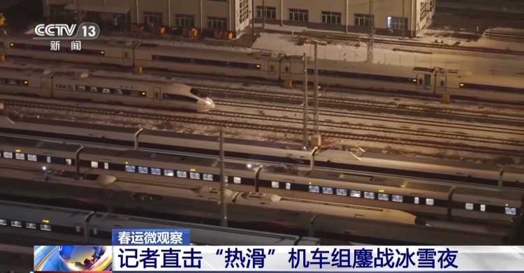 总台央视记者 蒋树林:凌晨4点多,我们跟随热滑车机组又回到了终点,整个一晚上郑州局出动了7组热滑车机组,来执行除冰、打冰的任务,如果按照公里来算超过了1000多公里,这是他们确保春运安全的一个重要举措,但也是这一段时间他们工作的日常。