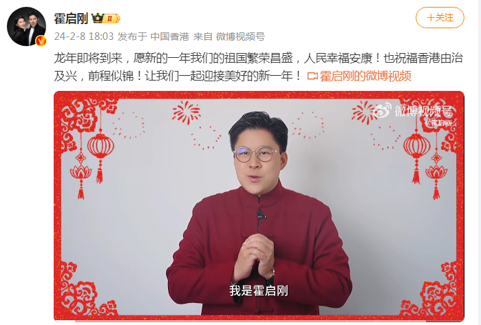 【环球网报道】2月8日,香港立法会体育、演艺、文化及出版界议员霍启刚在微博上发帖拜年。他发文说,“龙年即将到来,愿新的一年我们的祖国繁荣昌盛,人民幸福安康!也祝福香港由治及兴,前程似锦!让我们一起迎接美好的新一年!”霍启刚还在帖子中配了一段拜年视频。