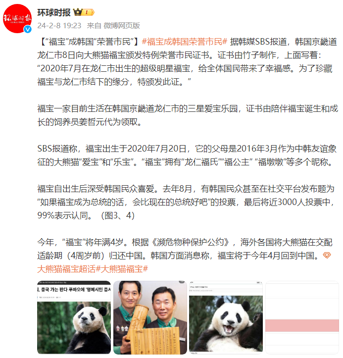 今年,“福宝”将年满4岁。根据《濒危物种保护公约》,海外各国将大熊猫在交配适龄期(4周岁前)归还中国。韩国方面消息称,福宝将于今年4月回到中国。