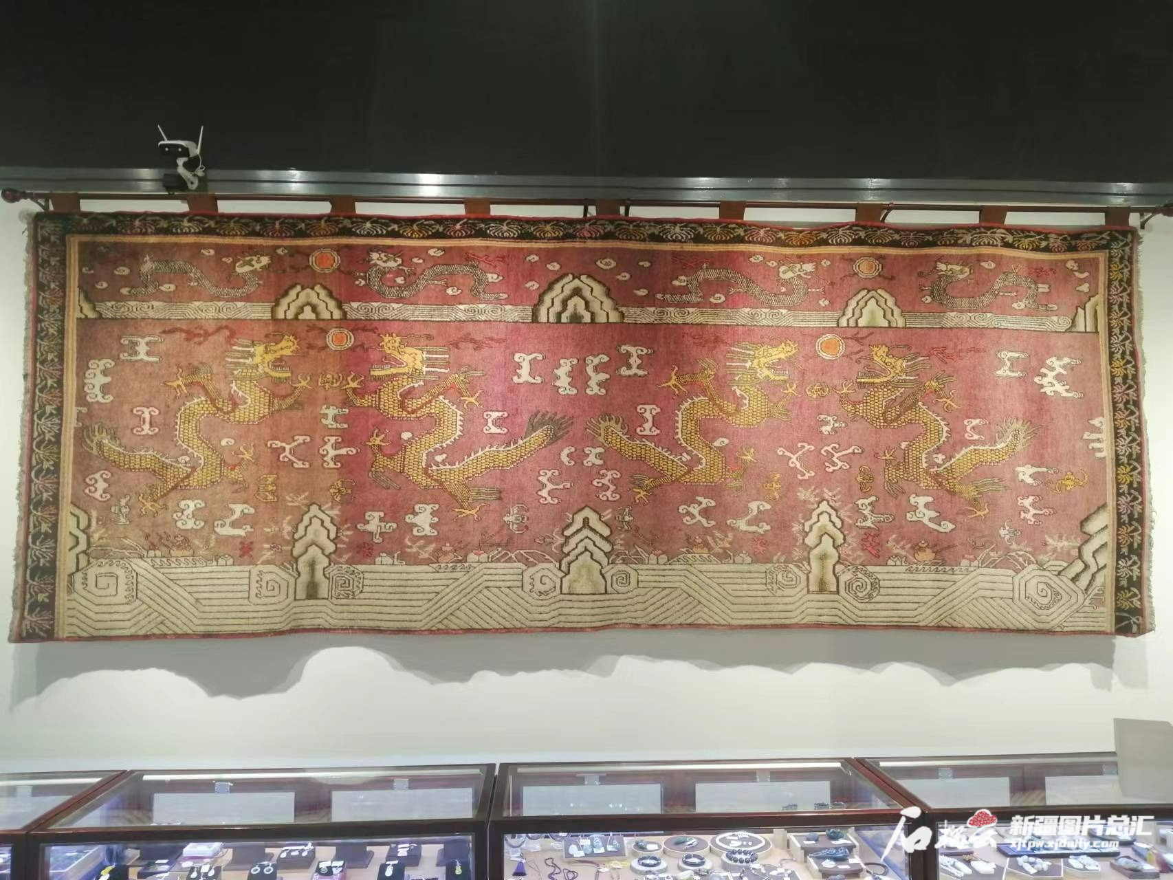 在自治区博物馆二期新疆文物总店里,一张横挂于大厅醒目位置的巨幅龙纹地毯,彰显着它的雍容华贵和与众不同。
