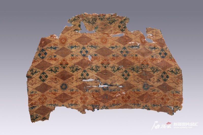 巴音郭楞蒙古自治州博物馆馆藏珍贵文物。自汉代开始,新疆正式成为中国版图的一部分,与中原地区的联系更加密切。2002年,在巴音郭楞蒙古自治州尉犁县老开屏墓地出土的黄地菱格龙璧纹锦就是最好的诠释,它直接实证了西域与中原之间在物质文化和生产技术等方面的交往交流。