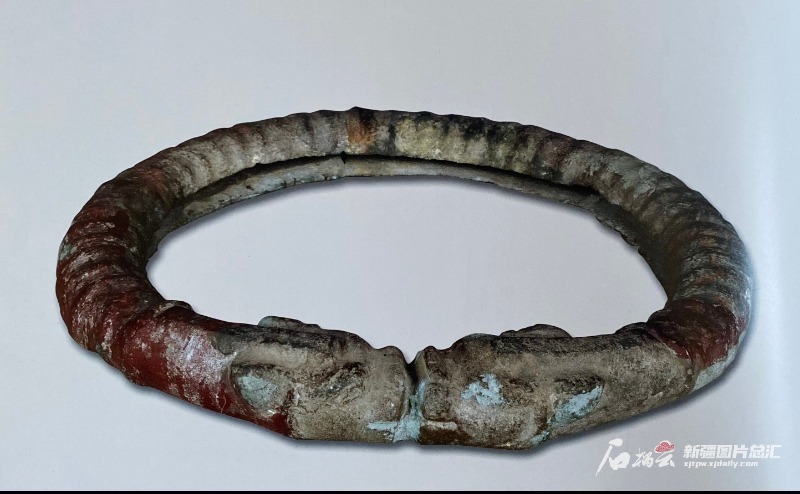 对龙铜环出土于新源县七十一团渔场墓葬,年代在公元前500年。该文物直径37厘米,高5厘米,青铜铸造,环体中空,内侧有一条开口,表面起凸棱纹,环圈的前部为吻部相对的两个龙头,头部后圈身为龙身,铜环纹饰精致,制模和铸造工艺非常成熟。
