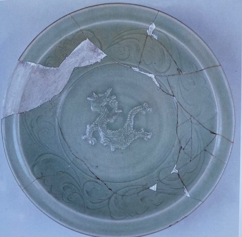 龙舞海浪盘出土于霍城县阿里麻里古城,现藏于新疆维吾尔自治区博物馆,年代为元代,其高7.5厘米、口径33.8厘米、足径11.5厘米。该器物敞口,宽沿,通体施青釉,盘底有一条舞动的龙纹,内壁饰有卷浪纹,外壁刻划一周莲瓣纹。