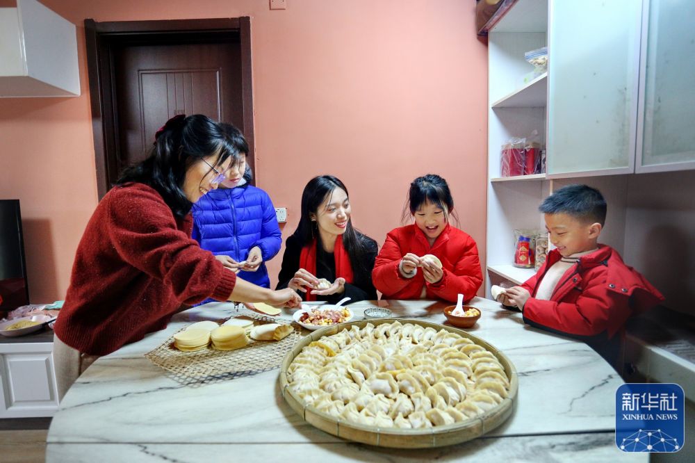 ↑2月9日,在广东省鹤山市沙坪街道一家人在包饺子,享受团圆之乐。新华社发(黄继明摄)