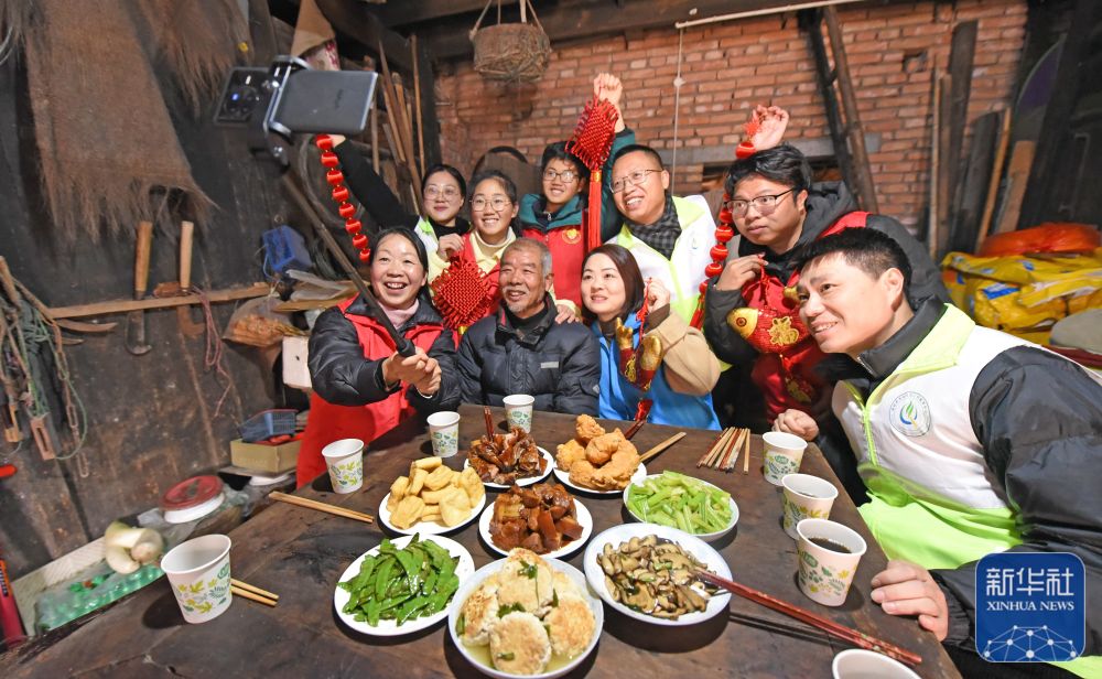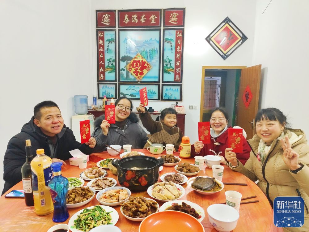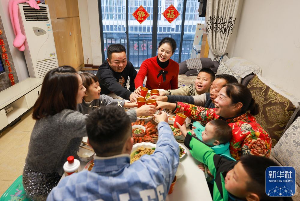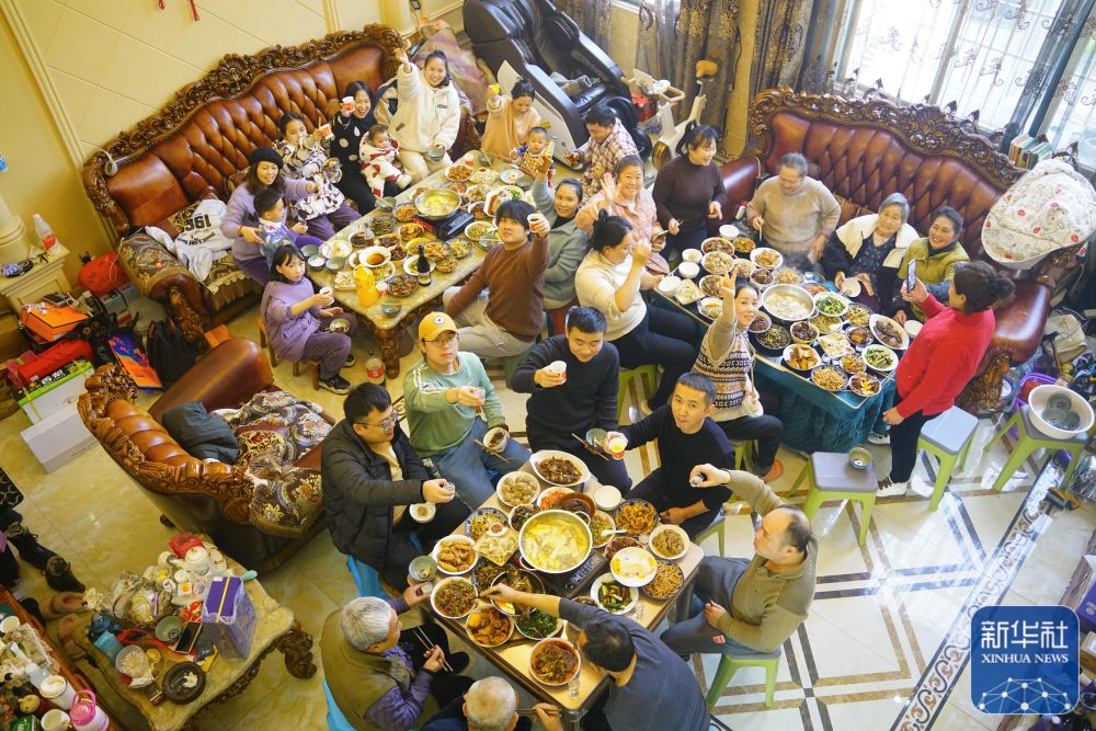 ↑2月9日,在安徽省滁州市来安县独山镇裴集村,一户居民在吃年夜饭。新华社发(陈家乐摄)