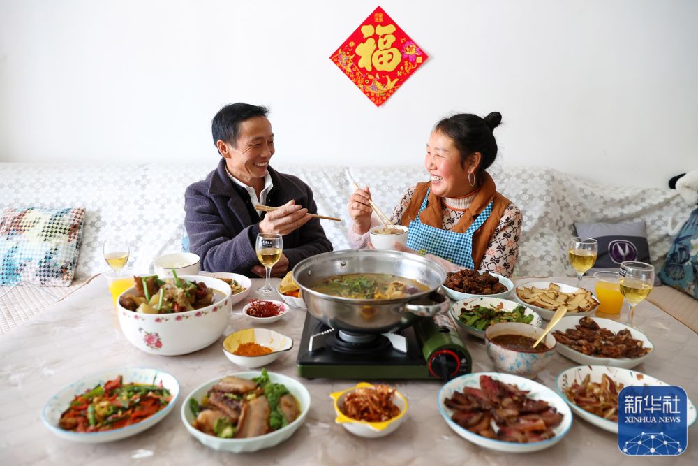 ↑2月9日,重庆市黔江区城南街道李家溪易地扶贫搬迁安置点居民石胜刚和妻子吃团圆饭。新华社发(杨敏摄)