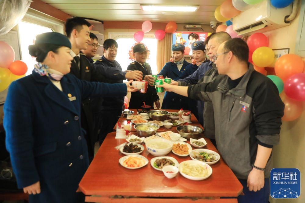 ↑2月9日,在位于浙江省舟山市朱家尖蜈蚣峙客运码头的“新海华69”船舱内,船员利用休息时间一起吃团圆饭。新华社发(陈永建摄)