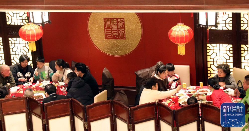 ↑2月9日,人们在江苏省苏州市一家餐馆内享用团圆饭。新华社发(杭兴微摄)