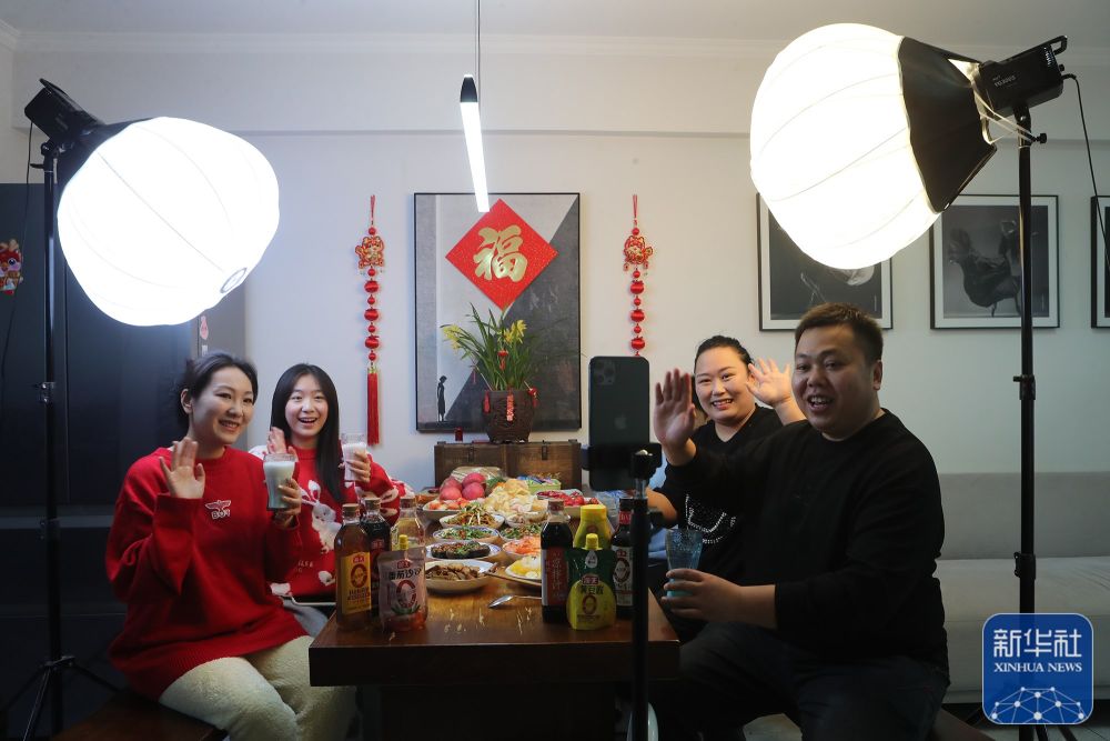 ↑2月9日,河南省商丘市一名网络主播(左一)在家中直播吃团圆饭。新华社发(李恒摄)