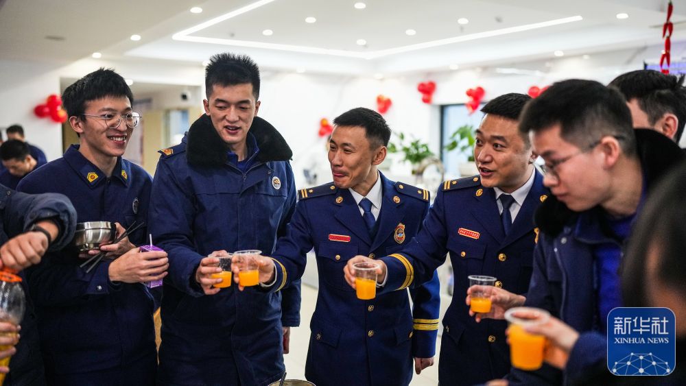 ↑2月9日,消防员们在贵州贵阳市云岩区消防救援大队食堂举杯庆祝。新华社记者 陶亮 摄
