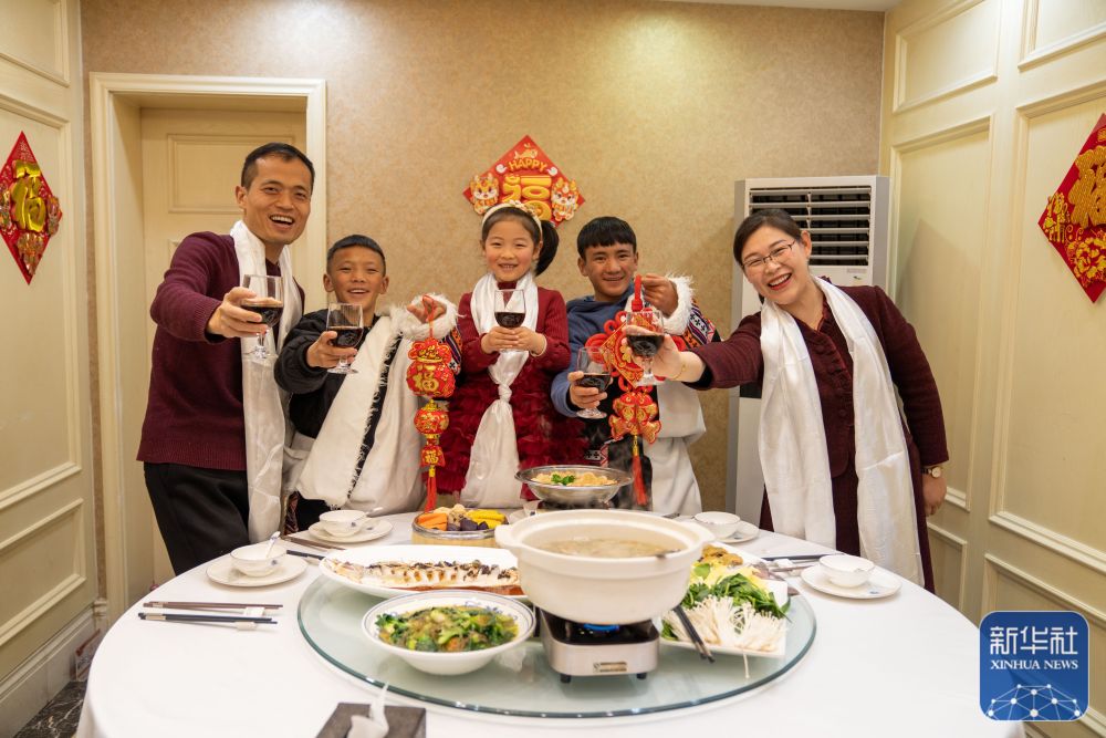↑2月9日,合肥理工学校西藏班的学生桑杰顿珠(左二)、次巴扎西(右二)和包保老师万霞(右一)一家贺新春、吃年夜饭。新华社发(阮雪枫摄)