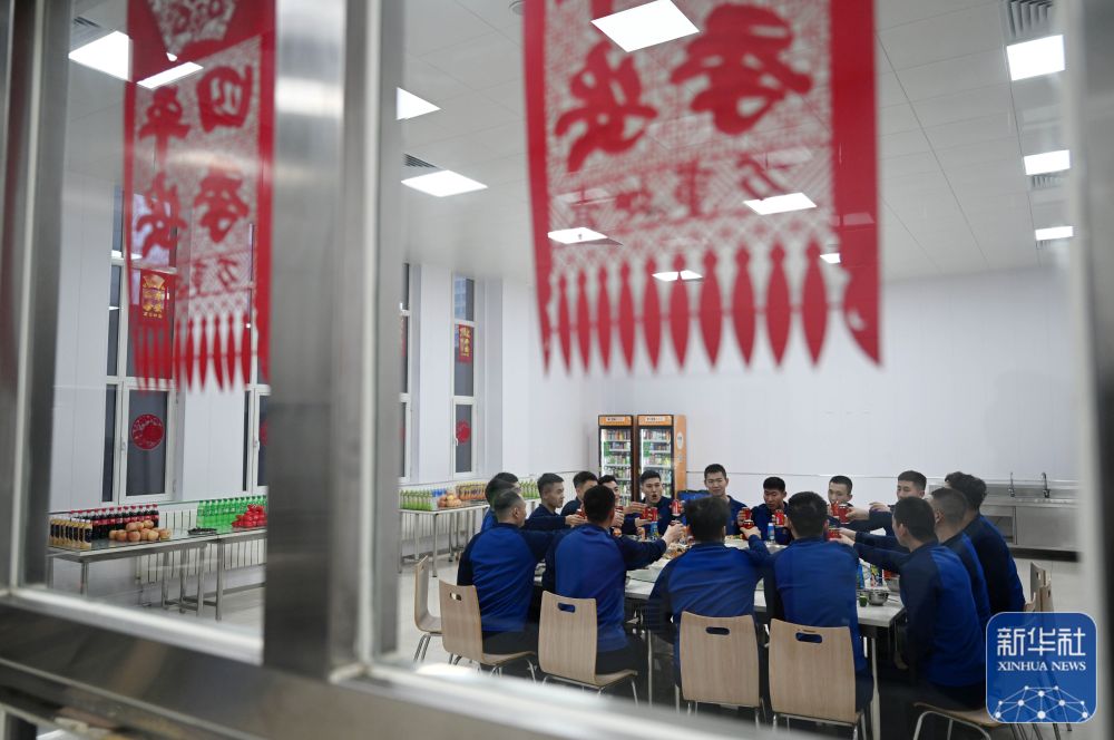 ↑2月9日,在天津市津南区南环路消防救援站,消防人员在食堂一同吃年夜饭。新华社记者 赵子硕 摄
