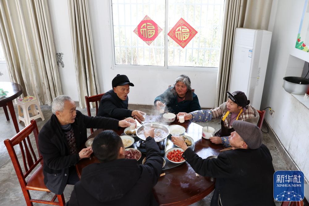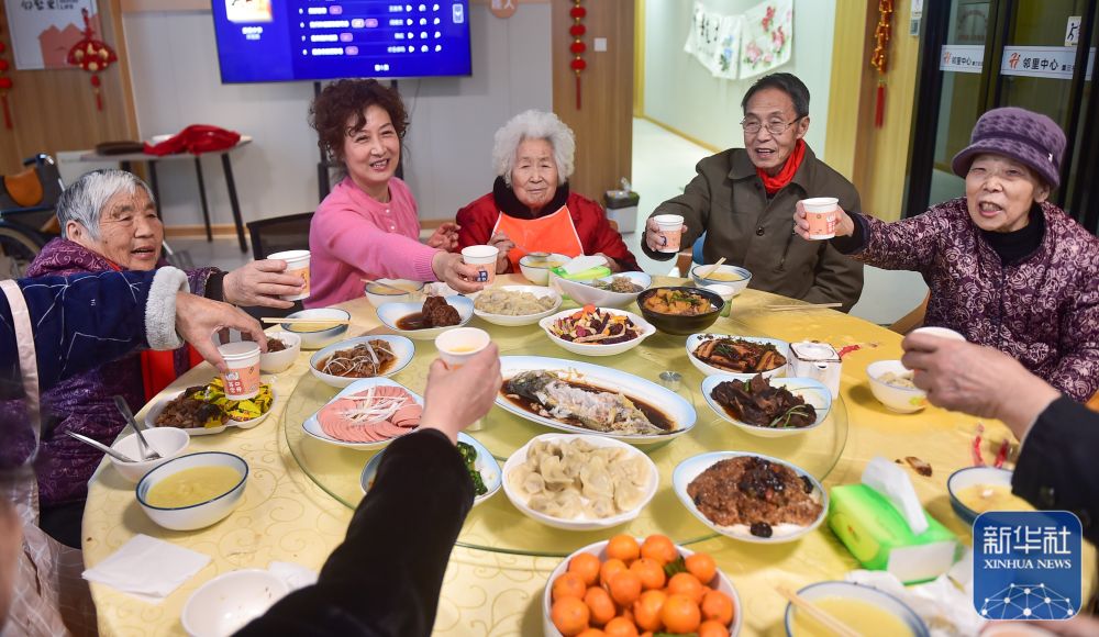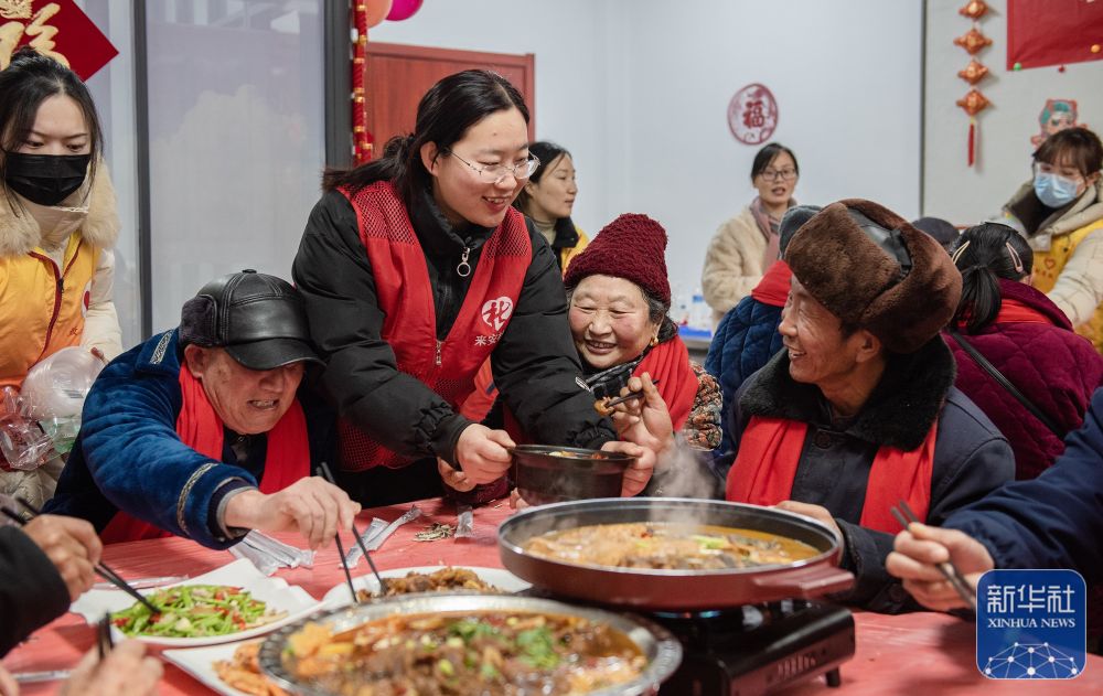 ↑2月9日,安徽省滁州市来安县新安镇社工组织空巢老人一起吃爱心年夜饭。新华社发(吕华摄)