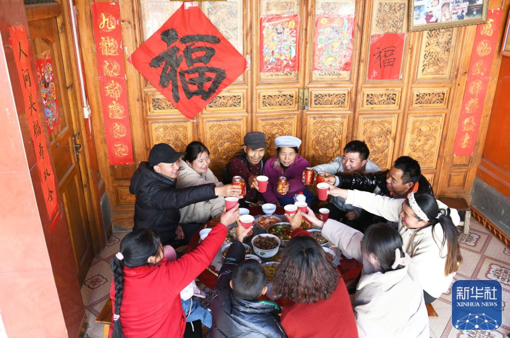 ↑2月9日,在云南省大理白族自治州剑川县马登镇文屏村,白族村民一家人在吃年夜饭。新华社发(赵庆祖摄)