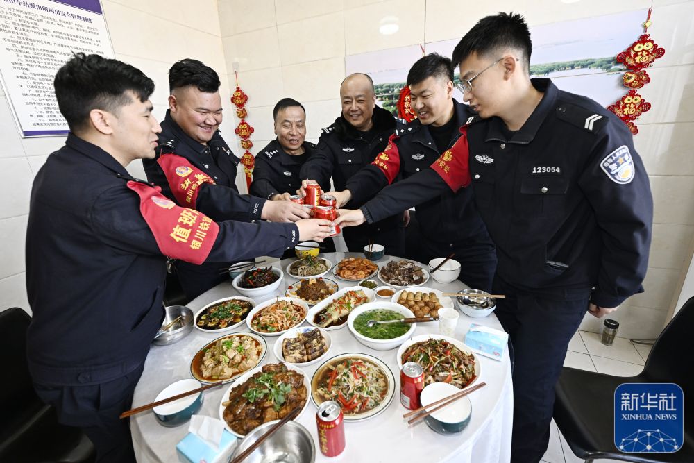 ↑2月9日,银川铁路公安处石嘴山车站派出所值班民警一起吃“年夜饭”。新华社记者 王鹏 摄