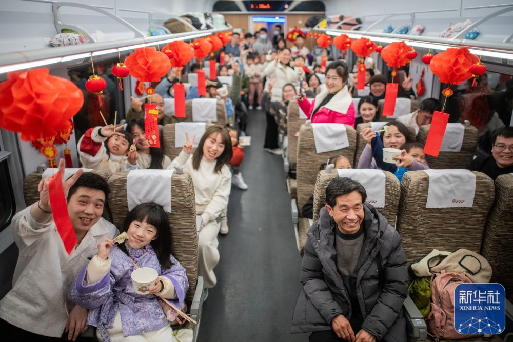 ↑2月9日,在D38次列车上,武汉客运段汉口城际动车组车间“凤舞楚天”乘务组为乘客发放饺子,大家一起吃饺子过除夕。新华社记者 伍志尊 摄