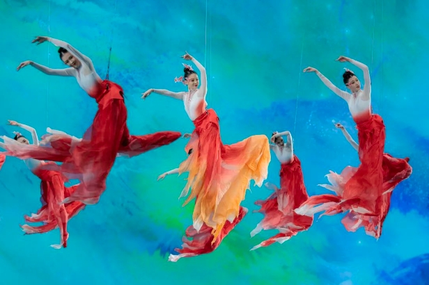 用领舞华宵一的话来说:“落地发力的时机错过0.01秒,我蹬地就借不住力量,身体就被威亚带走了。所以我要跟它抢时机,每一次发力都要非常精准。”跳《锦鲤》,要时时刻刻与绳索“沟通和对话”。