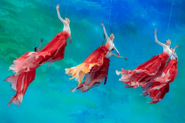 《锦鲤》创新在哪里?就新在它前所未见的舞蹈形式。 威亚舞蹈并不新鲜,但普通威亚只能完成直线升降和平移,难以展现出鱼儿随波“荡漾”的感觉。而《锦鲤》中演员的舞步一点一蘸,如同踏着碧波律动,秘诀就在于为该舞定制的原创性技术:在威亚上增加弹簧绳。