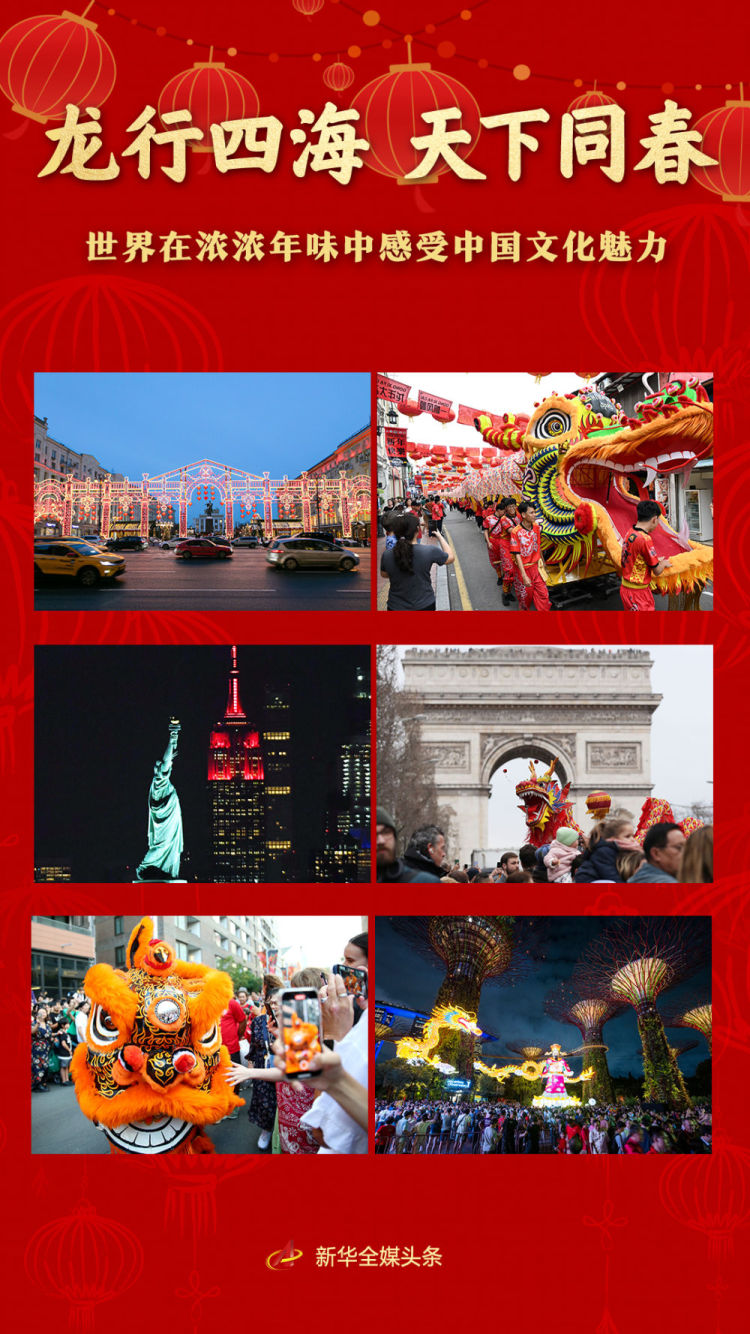 从各国使节在联合国体验包饺子、写福字,到瑞士日内瓦万国宫高悬起大红灯笼,从新加坡“春到河畔”的巨龙灯饰熠熠生辉,到马来西亚马六甲的百余少年共舞长龙……天下同春,龙年的祝福正从四面八方传来。