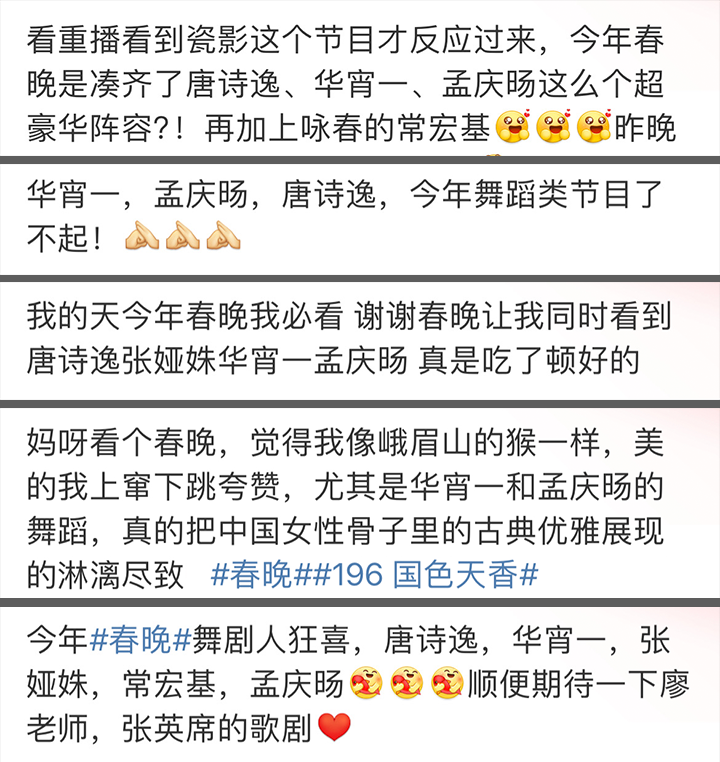 舞蹈迷们发现,今年的春晚舞蹈节目配置太高,能聚起如此众多现役顶尖舞蹈家的,也就只有春晚的舞台了。但舞蹈节目的成功除了有顶尖舞者的才华,最重要的,还有创作者的诚恳。