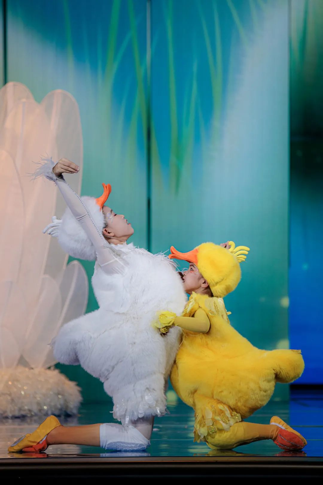 在初始版本中只有“小白鹅”,总台台长提出要把孩子们的憨态可掬呈现得更极致一些,要有幽默感、有剧情感,并建议增加一只“捣乱”的“小黄鸭”。经过重新编排,舞蹈一下子有了更多灵气,“小黄鸭”穿梭在大小白鹅之中,不仅让整体清冷的色调增加了一抹暖色,还让舞蹈内容更加丰富,童趣更加饱满。