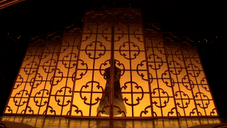 《咏春》来自舞剧《咏春》选段,已经上演了百场,但在春晚是个特别的版本。为了创造出更加意蕴丰富的想象空间,总台台长慎海雄在推荐这个舞剧片段时,提出了几个建议,包括演员服装从黑色的香云纱改为绛红色,男女主角之间的关系要从男主角一一过招“大败”女主角改为相互切磋武艺,开场以男主角的武术剪影来增强吸引力,通过使用剪影效果来展现“叶问”的出场。当灯光亮起,窗棂上“咏春拳”三个书法大字淡去,“叶问”的剪影如同舞动的水墨画一般,随即演员闪身舞出屏风,影子与真身共舞。由虚入实,由平面到立体,“剪影”的设计让短短半分钟的独舞大大增加了层次感和观赏性,为空旷的舞台创造出一个“顶天立地”的叶问之影,视觉震撼瞬间放大,堪称画龙点睛之笔。