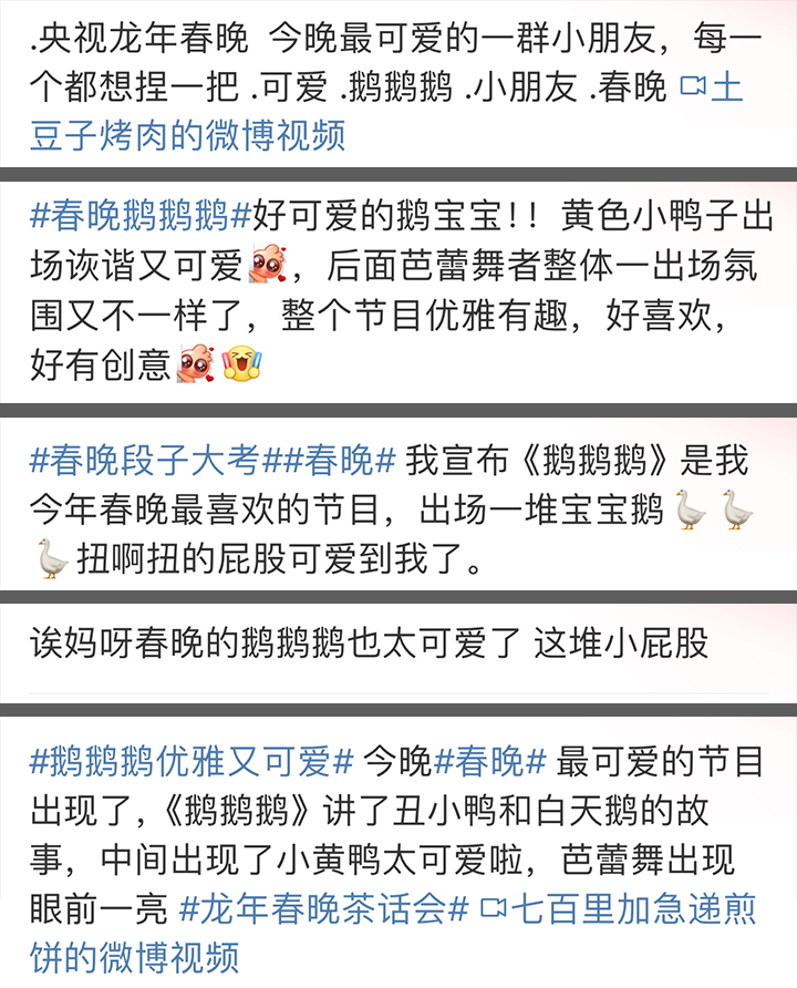 当你提“鹅鹅鹅”,自然要期待“曲项向天歌”。骆宾王、唐诗宋词、中华文化....看到节目单上的题目《鹅鹅鹅》,大概很多观众都以为是要咏诗。当大幕开启,柴可夫斯基的《天鹅湖》奏起,气氛瞬间变得端庄典雅了,可接下来出场的是一群圆滚滚、扭着屁股的小小鹅,这波反差萌,让网友直呼“创意绝了”。