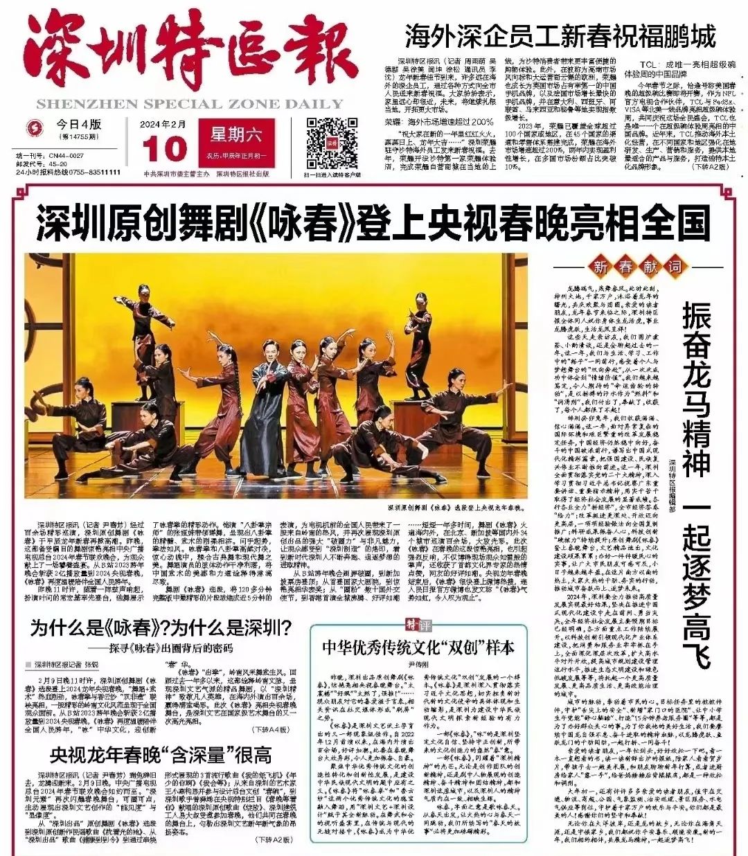 《深圳特区报》在大年初一头版头条对《咏春》做了报道。光明日报原总编辑何东平等首都文化界专家学者在采访中纷纷为《咏春》成功登陆春晚大舞台而点赞。