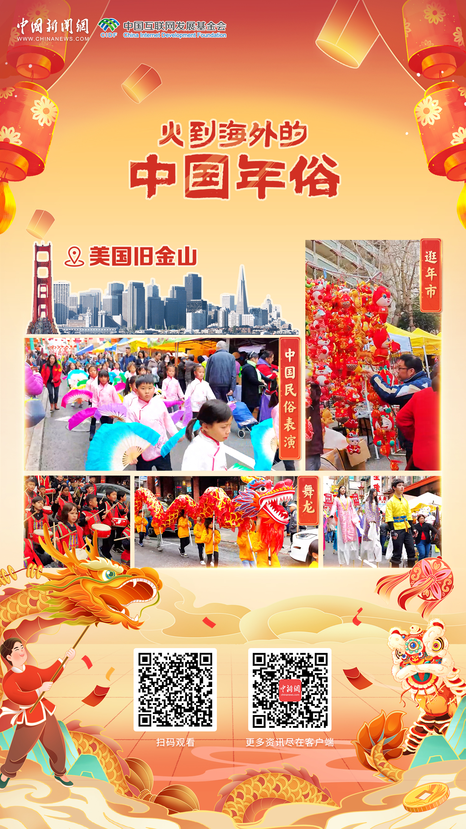 每逢过年,美国旧金山唐人街都会举办春节花市。在这里,海外民众不但能购买到各种节日用品,还可以欣赏到中国民俗表演。好运、红包、舞龙等花市表演,也成了外国人印象深刻的中国年俗。