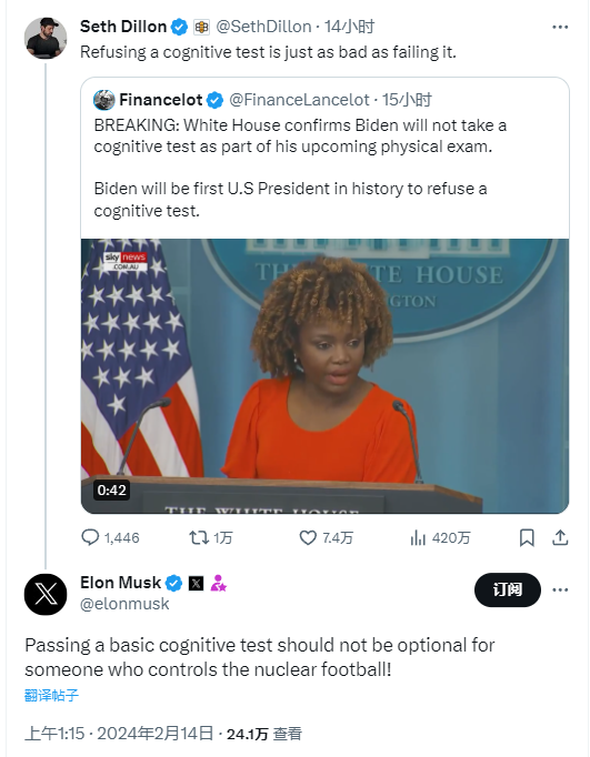 “对于控制核按钮的人来说,通过基本的认知测试不应该是可选项!”马斯克13日在该网友评论下留言称。