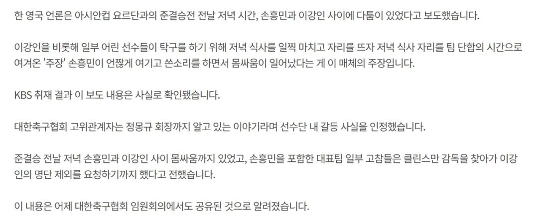 该媒体还报道称,在赛前一天晚上,孙兴慜等部分老队员找到主帅克林斯曼,要求把李刚仁排除在名单之外,但克林斯曼最终还是将李刚仁排在首发阵容当中。