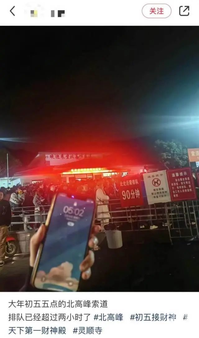 “米秋米秋”说,年初五自己都是起个大早来迎财神,2月14日凌晨2:40从良渚文化村出发,本来想从老东岳上山,结果今年上山入口要5点才开放,车开不到停车场,只能再到北高峰上山,那时候才3点多,以为自己到得算早的,没想到现场已经这么多人。