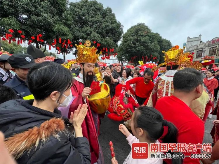 此外,多地还在寺庙周围举行盛大的庙会活动。在广西,市民游客到城隍庙广场喜迎财神。