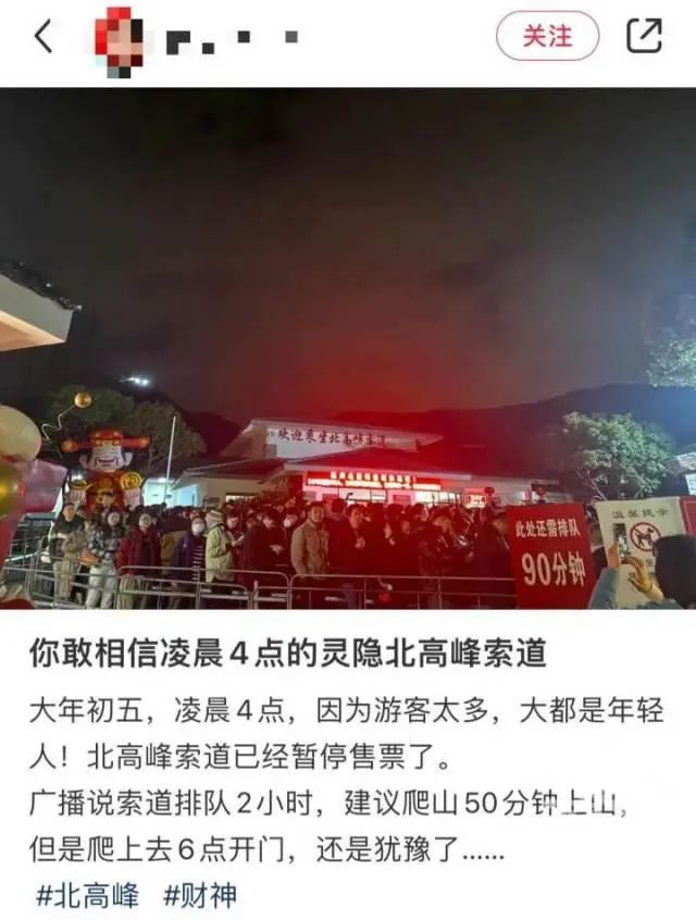 网友“米秋米秋”凌晨3点到北高峰山脚下,准备走游步道爬山上财神庙,现场已经人山人海。